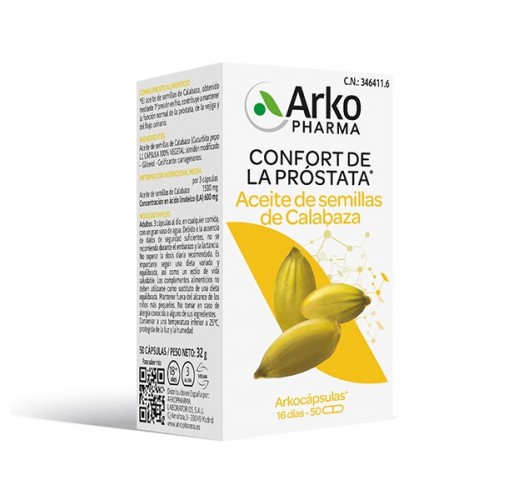 Arkocápsulas® Aceite de Semillas de Calabaza es un complemento alimenticio a base de aceite de semilla de calabaza, obtenido mediante la 1ª presión en frío, que contribuye a mantener la función normal de la próstata, de la vejiga y del flujo urinario.